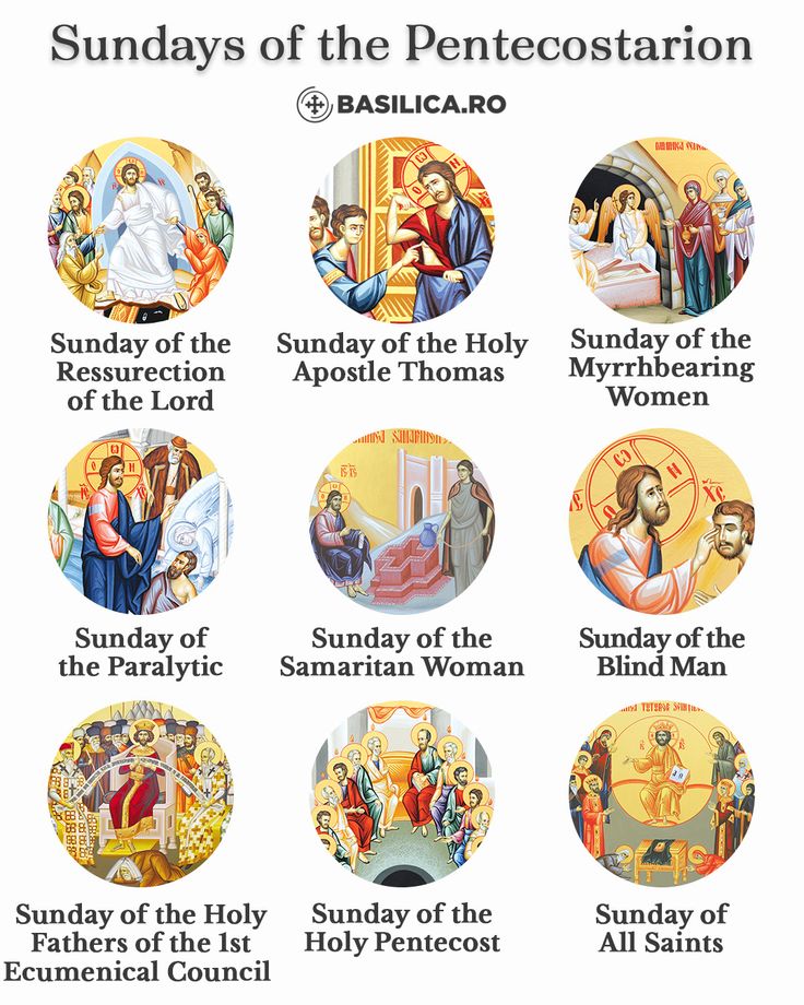 The Pentecostarion lasts 8 weeks from Sunday of the Resurrection of the Lord to the First Sunday after the Pentecost or Sunday of All Saints.