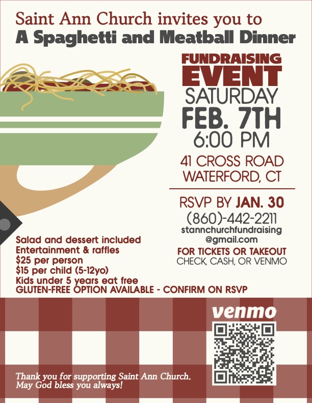 Please join us at 6pm on Saturday, February 7, 2026 as we kickoff our first fundraiser for St. Ann this year. Please RSVP, and/or place your takeout order for the exquisite Spaghetti and Meatball dinner, no later than January 30, 2026 deadline by calling us at 860-442-2211 or emailing stannchurchfundraising@gmail.com.